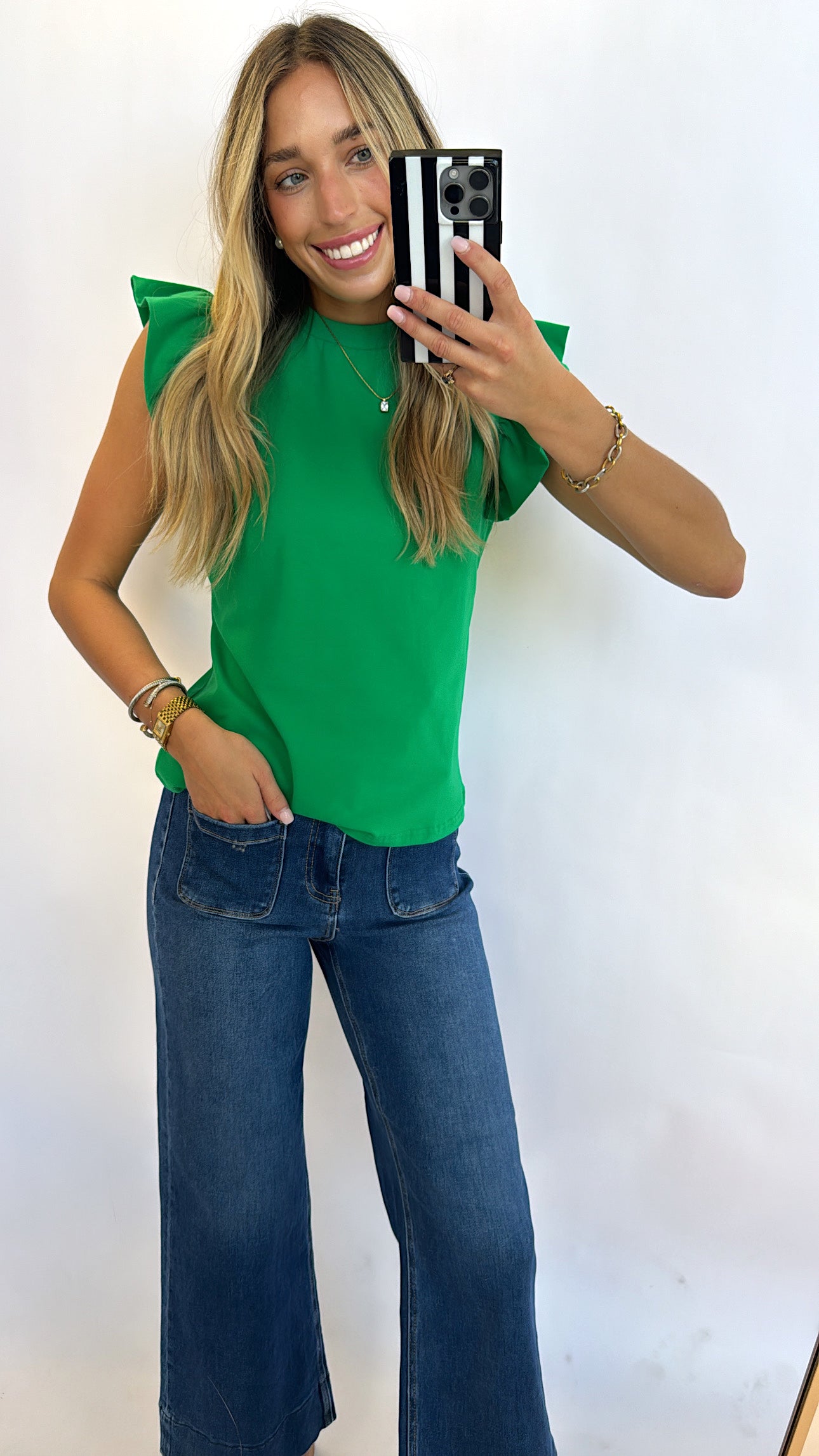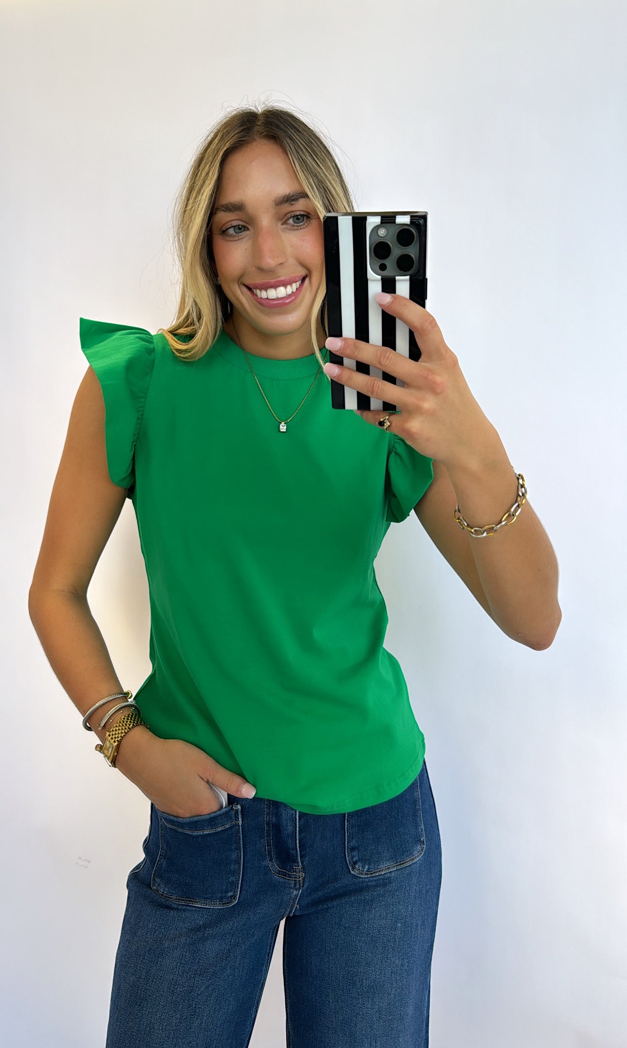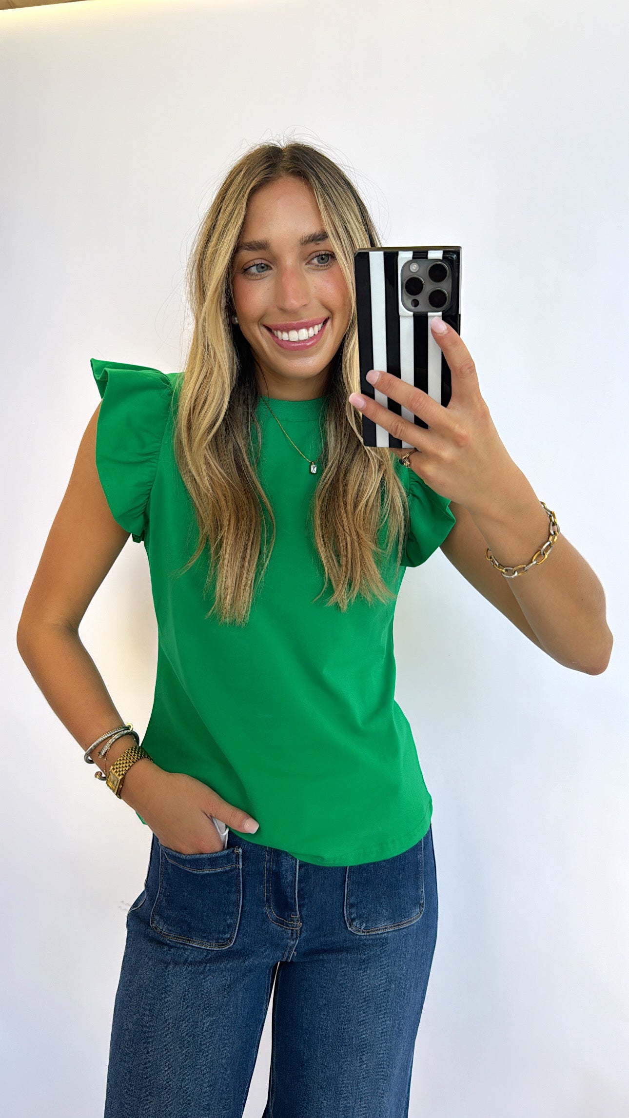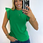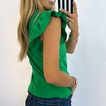 KELLY GREEN RUFFLE SLEEVE POPLIN TOP