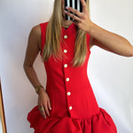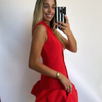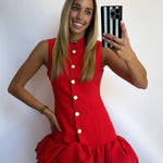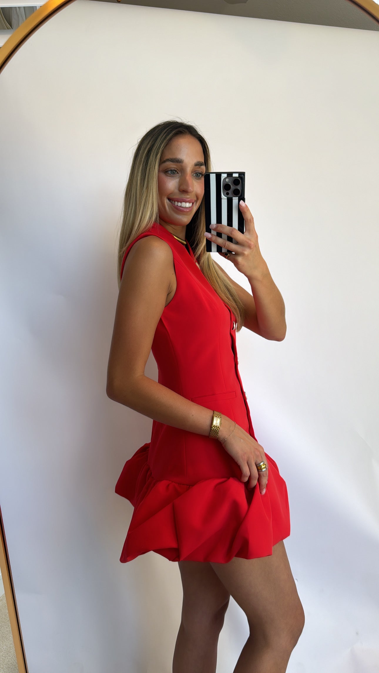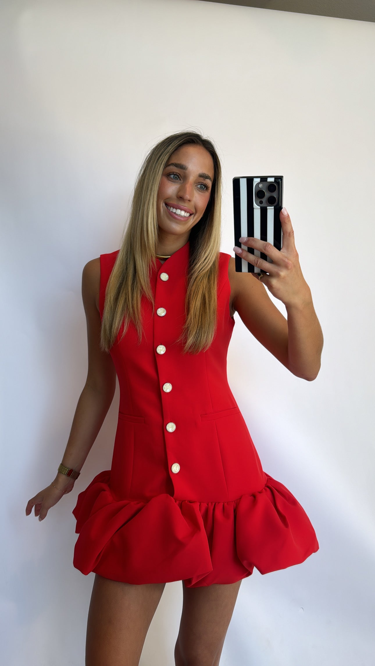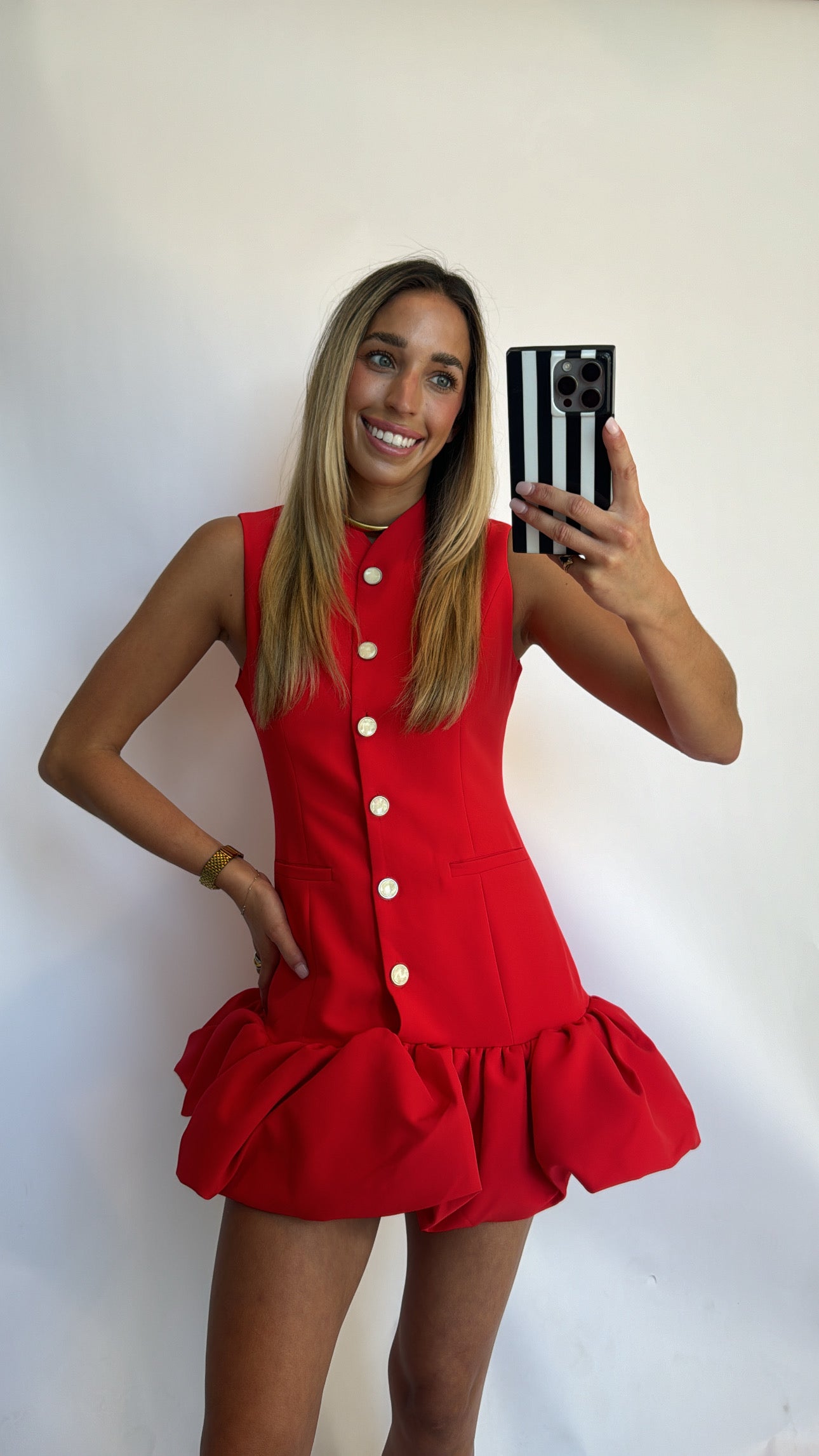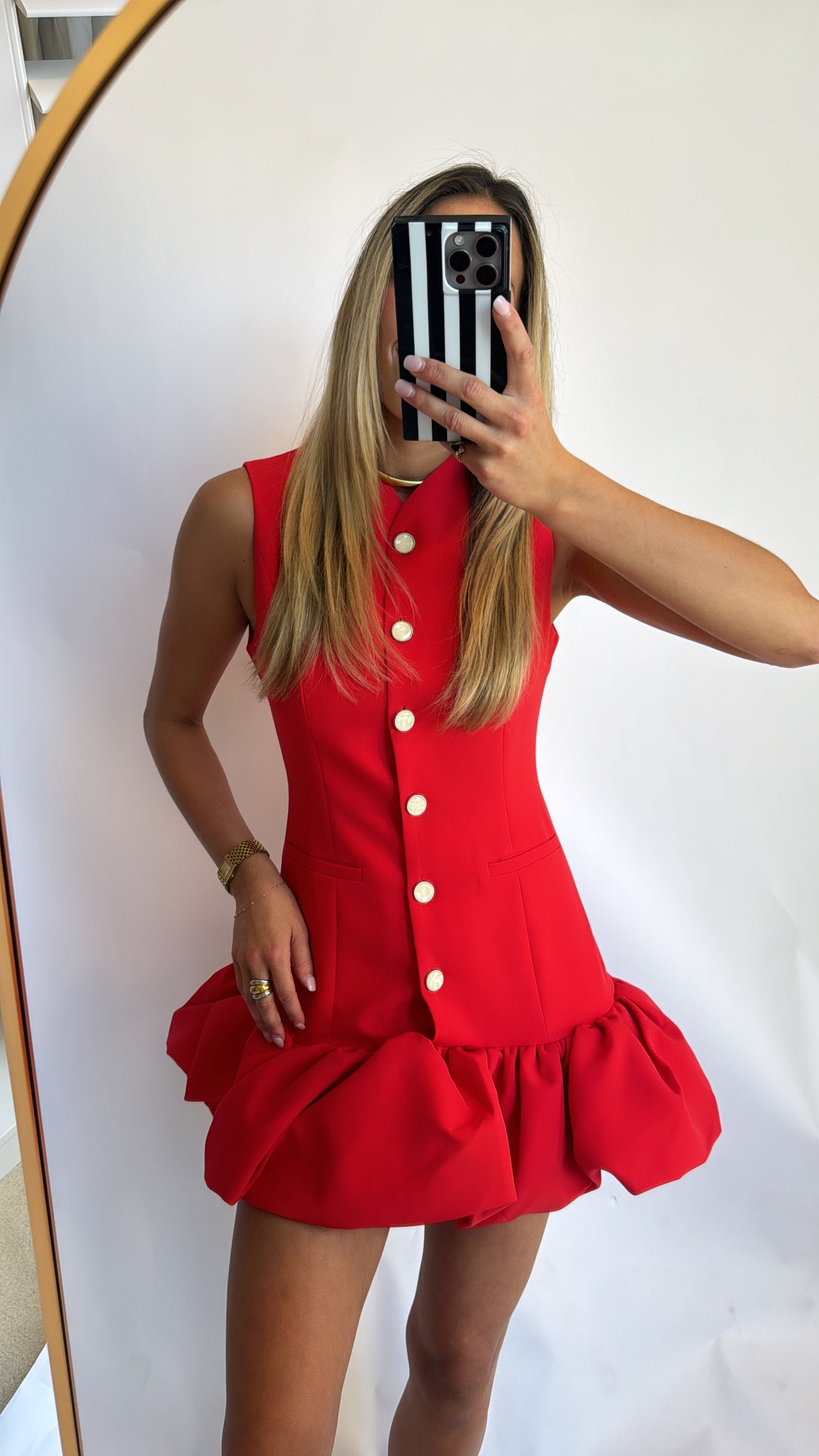 RED BUBBLE HEM BUTTONED MINI DRESS
