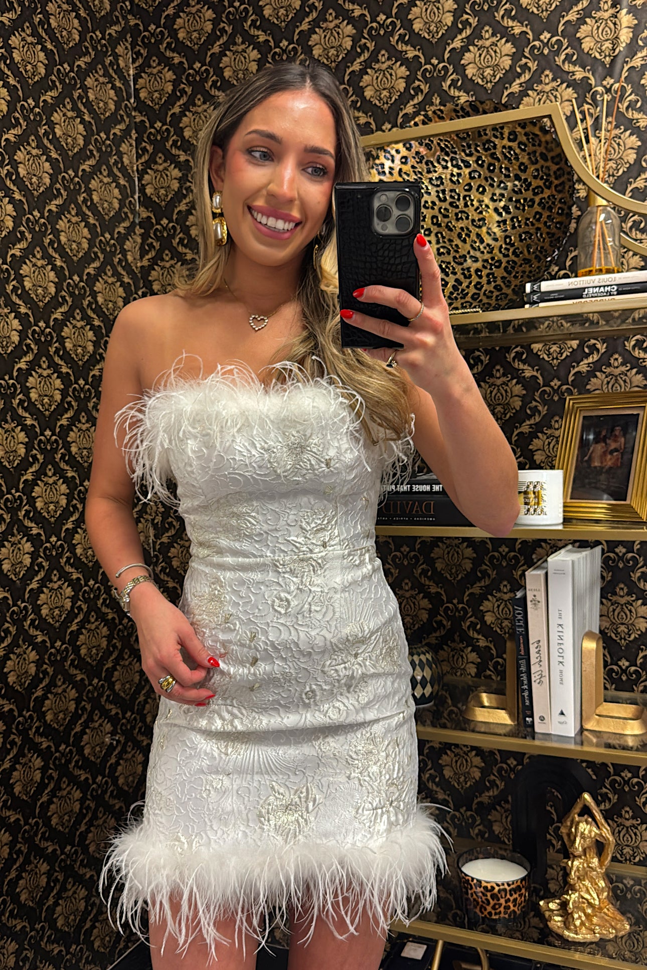 WHITE STRAPLESS FUR MINI JACQUARD DRESS