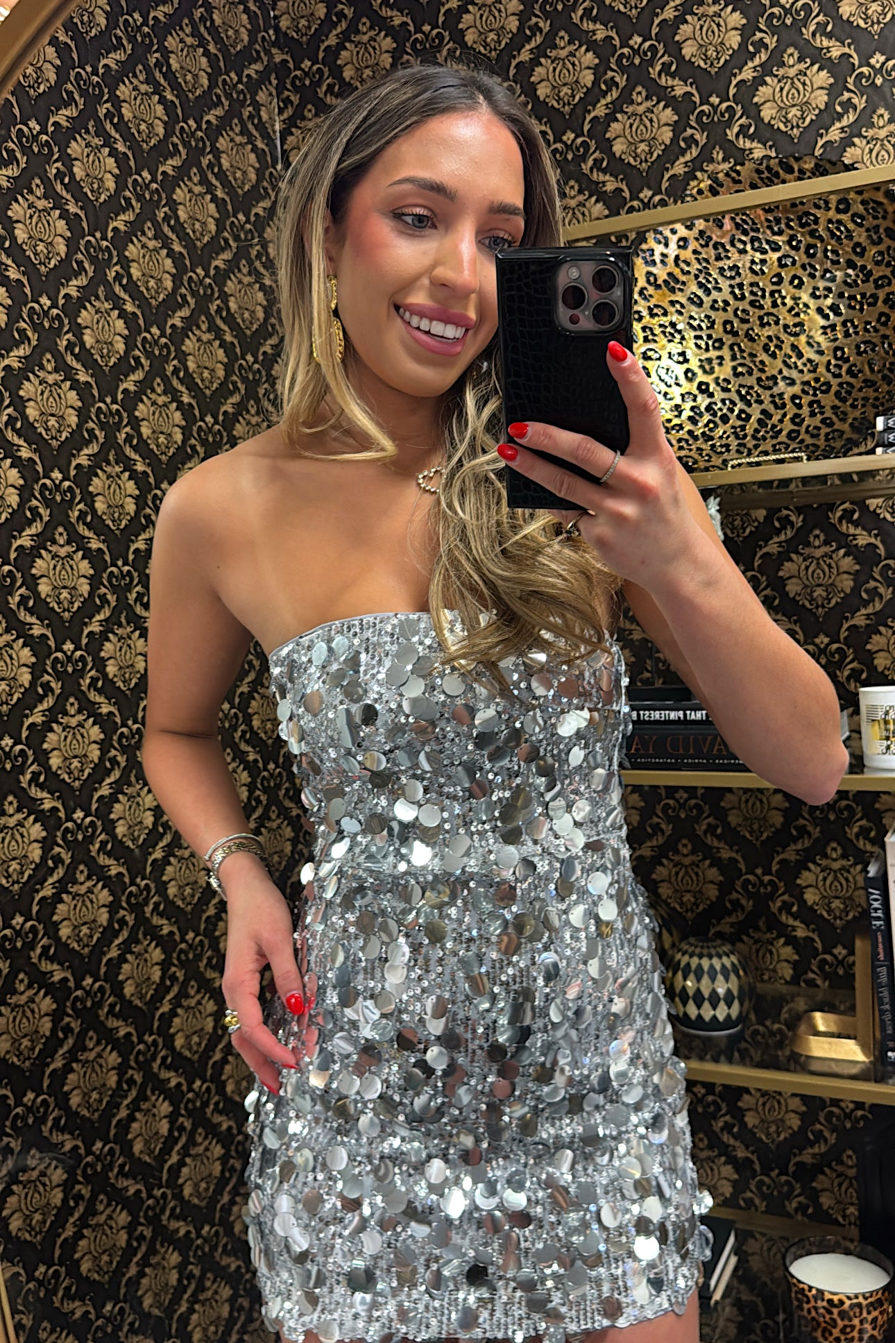 SILVER SEQUIN STRAPLESS MINI DRESS