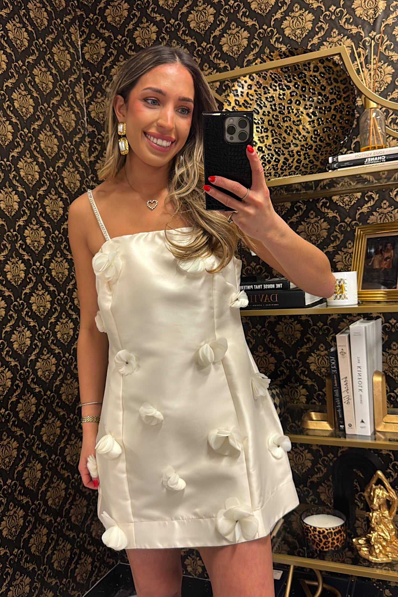 CREAM 3D FLORAL CHARM SATIN MINI DRESS