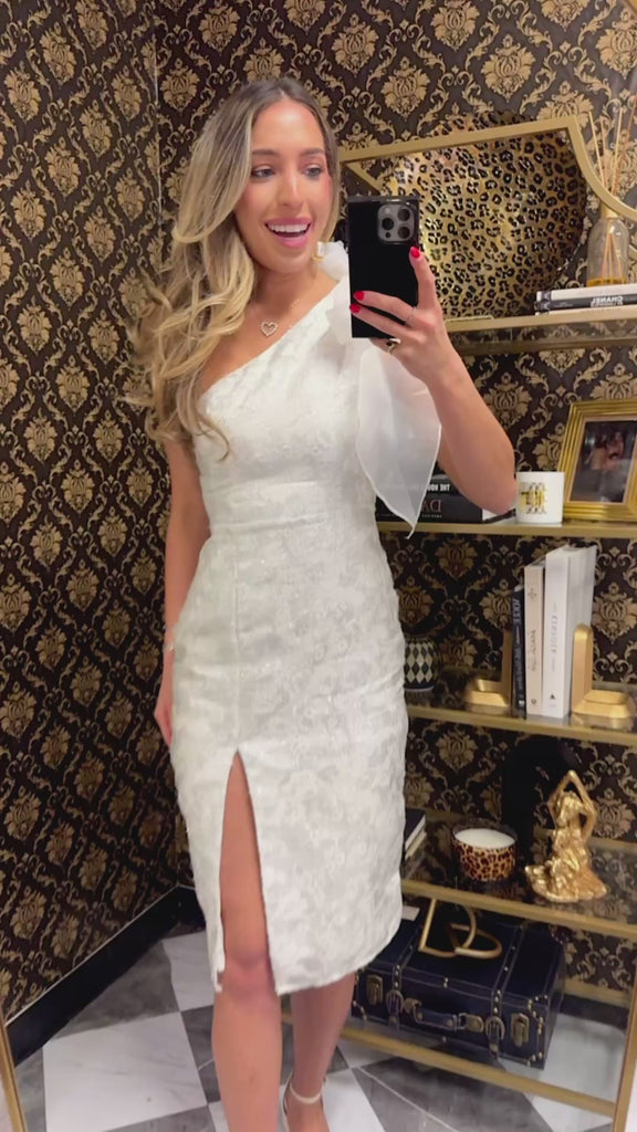 WHITE ORGANZA BOW ASYMMETRIC BODYCON MIDI DRESS