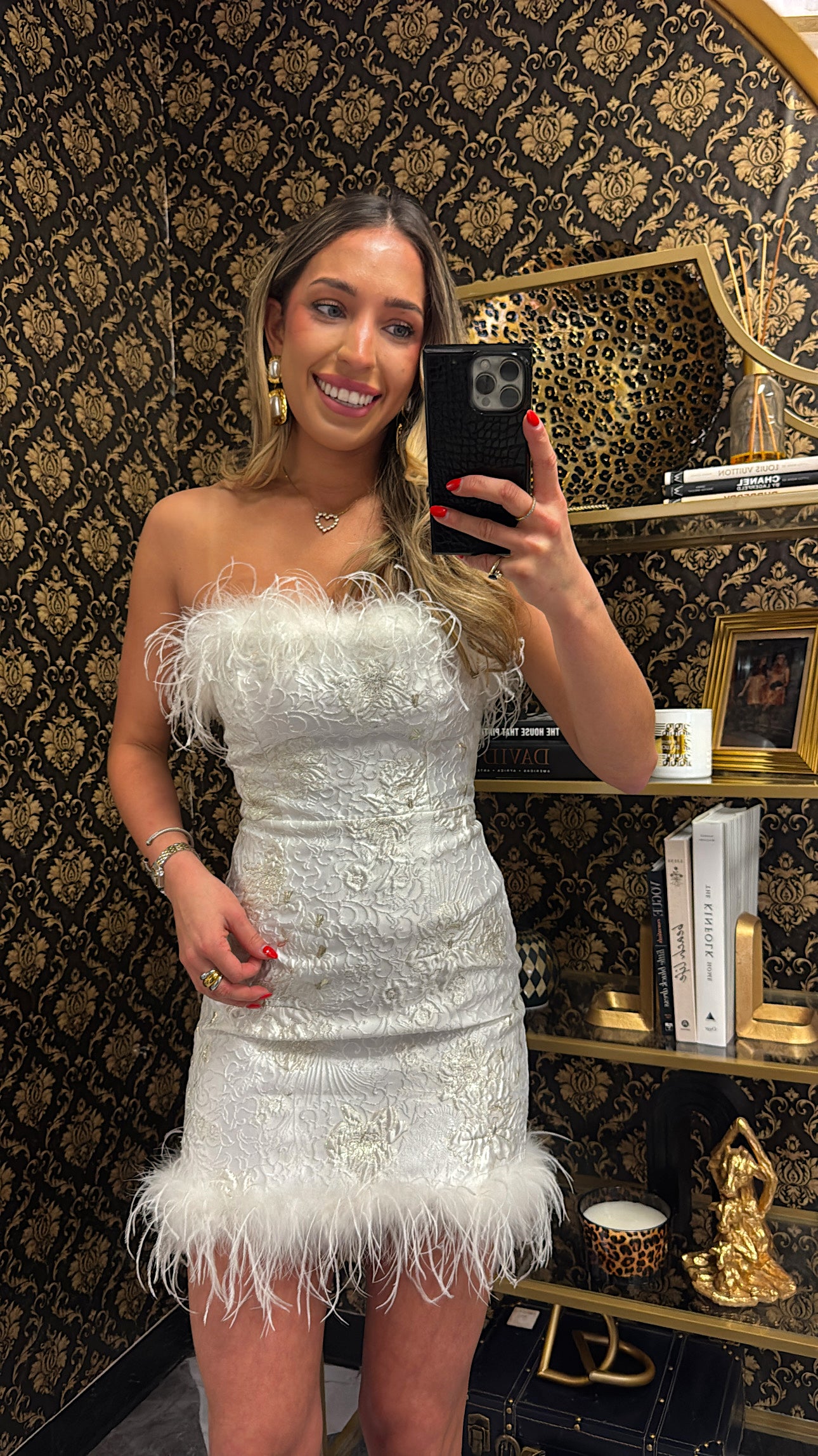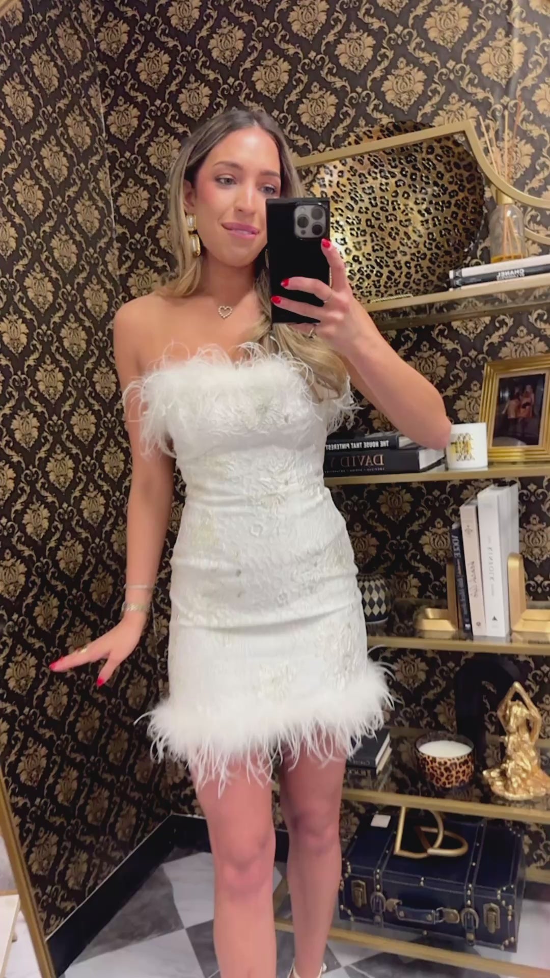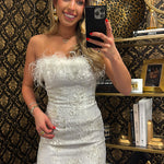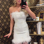 WHITE STRAPLESS FUR MINI JACQUARD DRESS