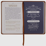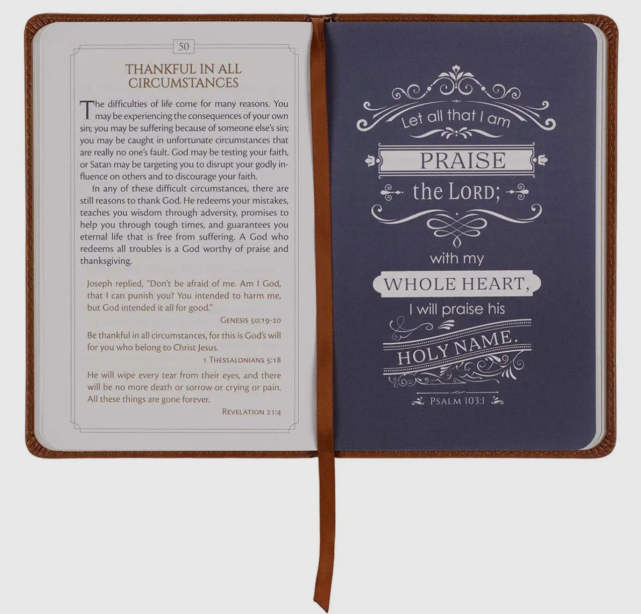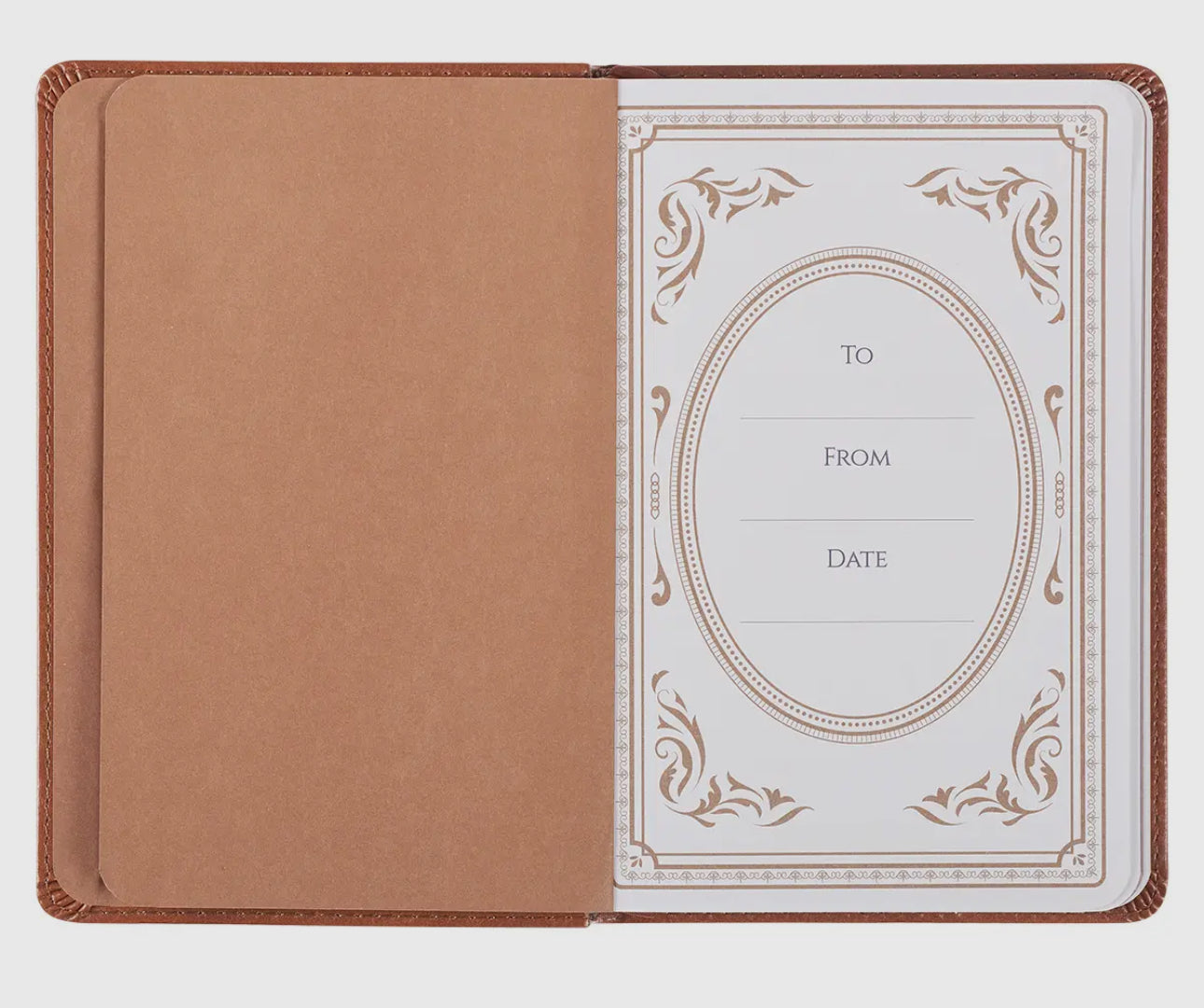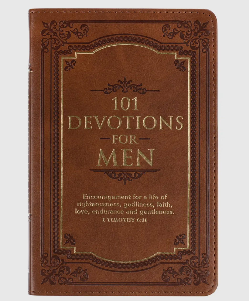The 101 Devotions for Men Tawny Brown Faux Leather Devotional features 101 powerful devotions and supporting Scripture verses to inspire men to rely on God's strength and stand firm on the truth of His Word.  The tawny brown faux leather cover of the devotional is decorated with an ornate heat-debossed frame with beautiful corner scroll designs. A thin gold-foiled line rims the interior and matches the gold foiled-title and Scripture verse. 101 Devotions for Men Encouragement for a life of righteousness, godliness, faith, love, endurance, and gentleness. 1 Timothy 6:11  This compilation of 101 devotions is the perfect length for a seasonal devotion and ideal for a man who likes to keep things moving. Each daily entry is numbered and features a short devotional passage followed by several supporting
