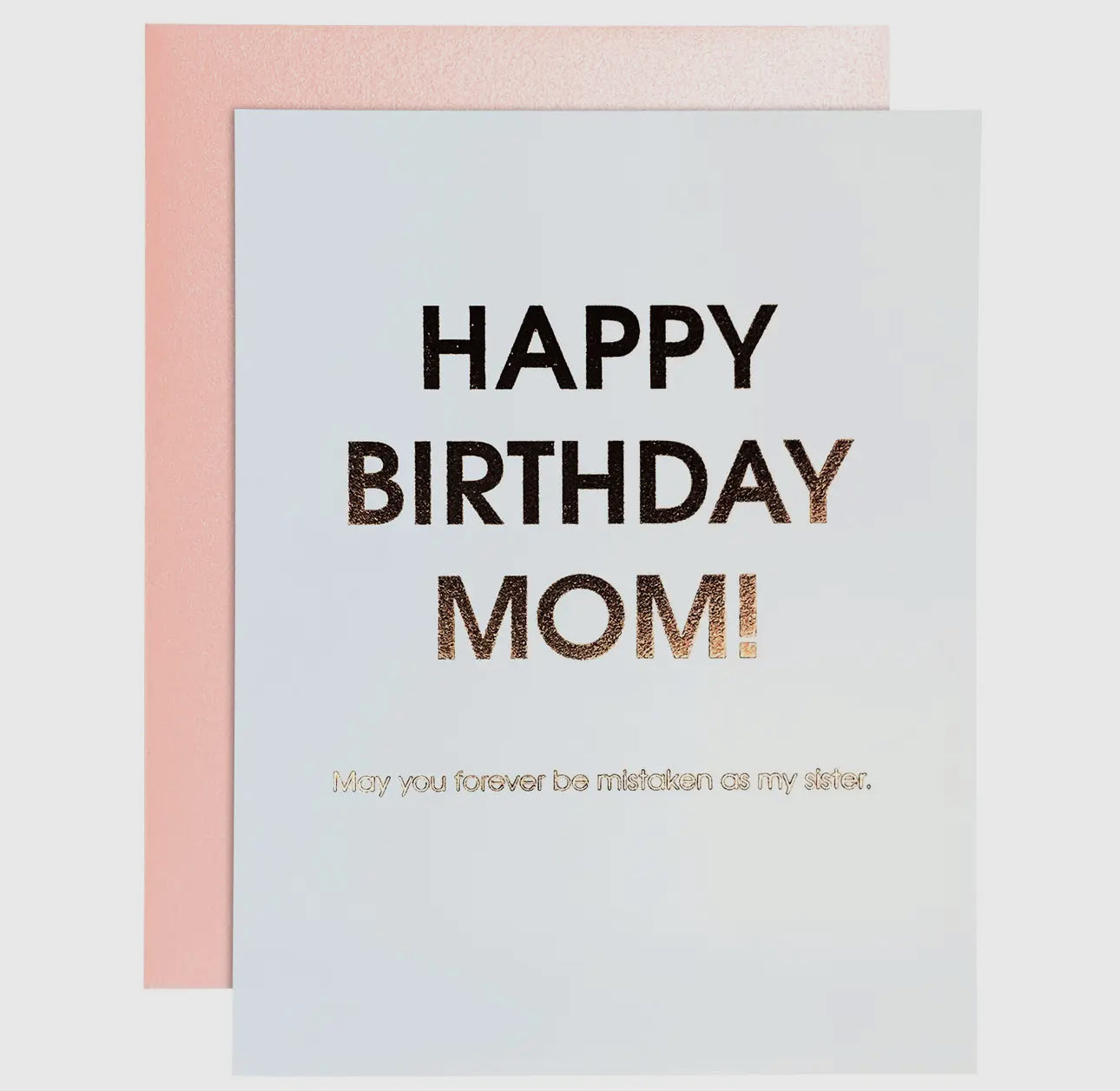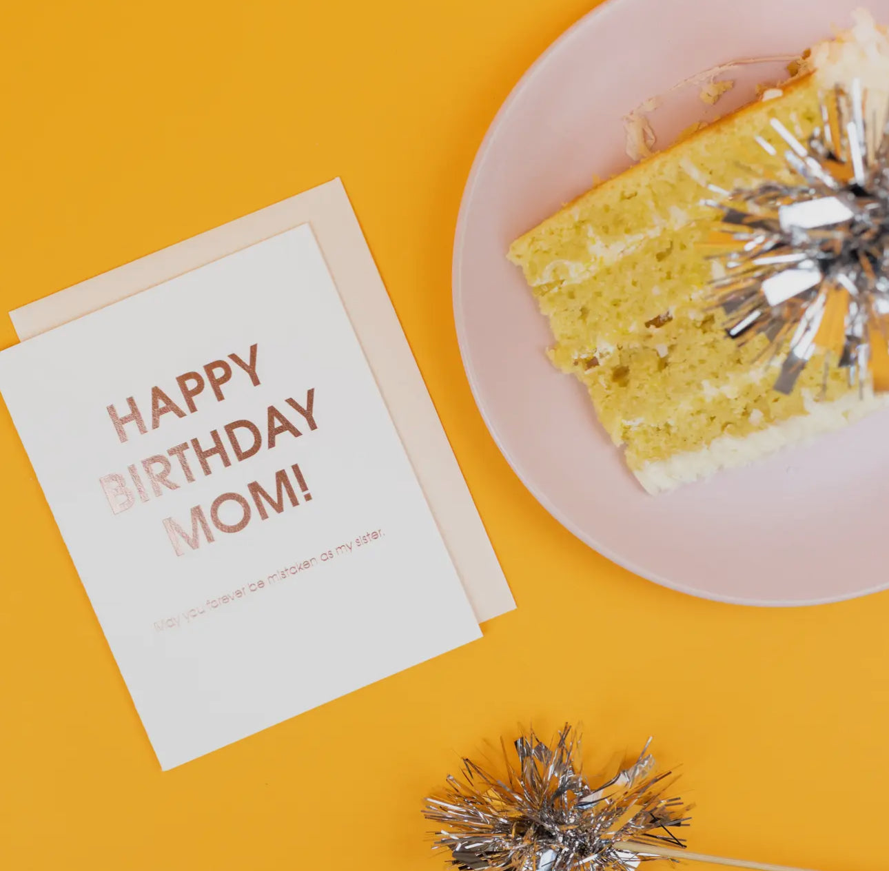 Our Birthday Mom - Mistaken As Your Sister card the perfect card for you mom's big day! The card is foil printed on a vintage printing press. Paper: Bright White, Tree-Free 100% Cotton Paper Foil: Rose Gold Envelope: Coral Size: 4.25" x 5.5" Folded card, blank inside Sealed in a cello sleeve