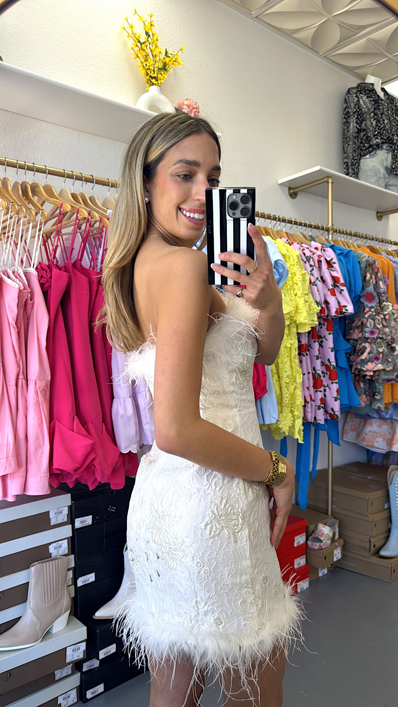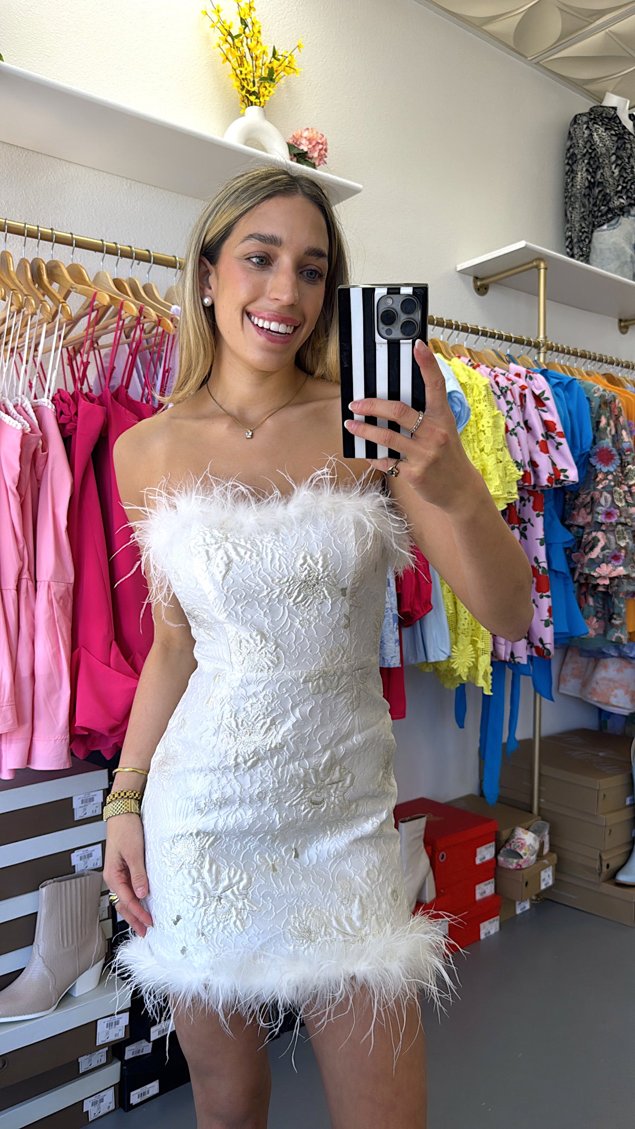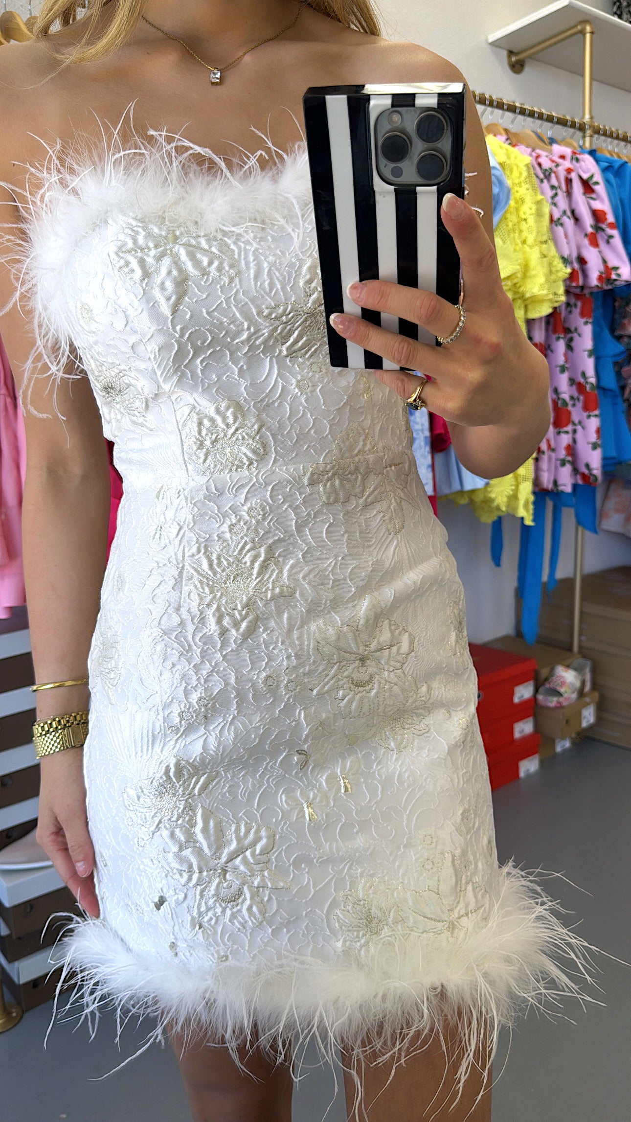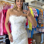 WHITE STRAPLESS FUR MINI JACQUARD DRESS