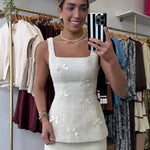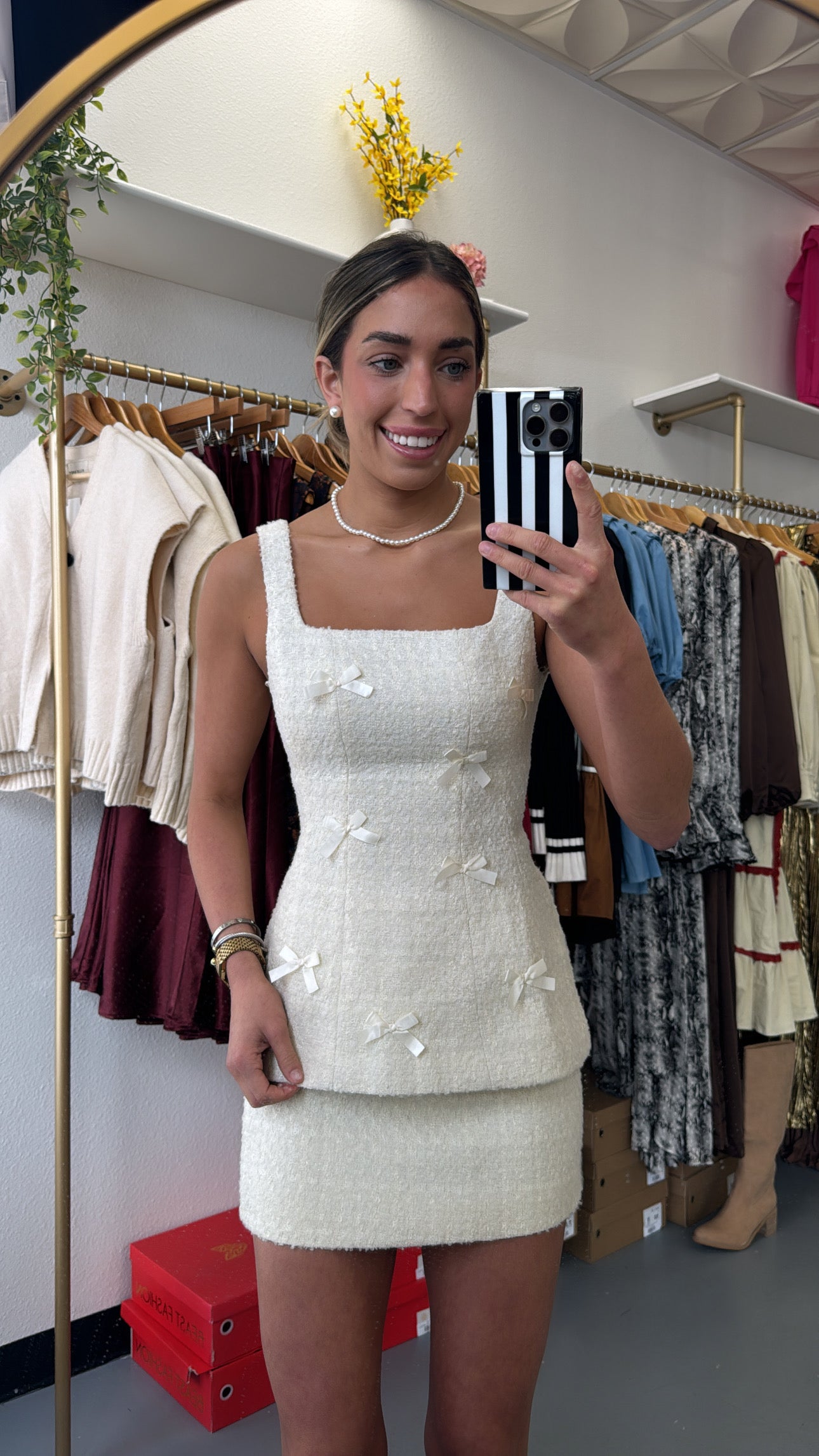 Cream Tweed Square Neck Bow Mini Skirt Set