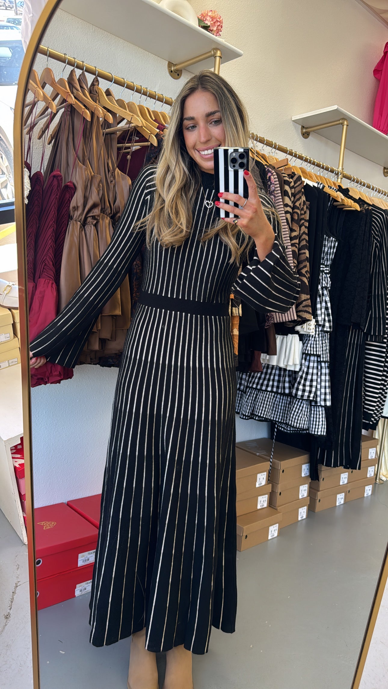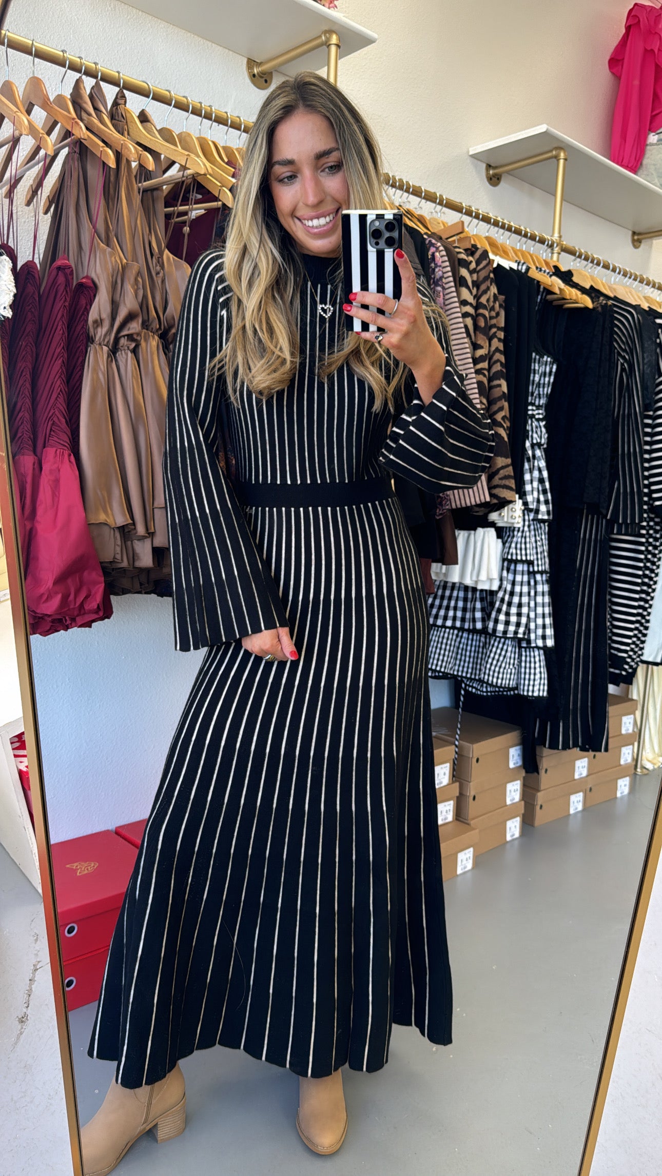 Black Stripe Rib-Knit Bell-Sleeve Maxi Sweater Dress