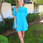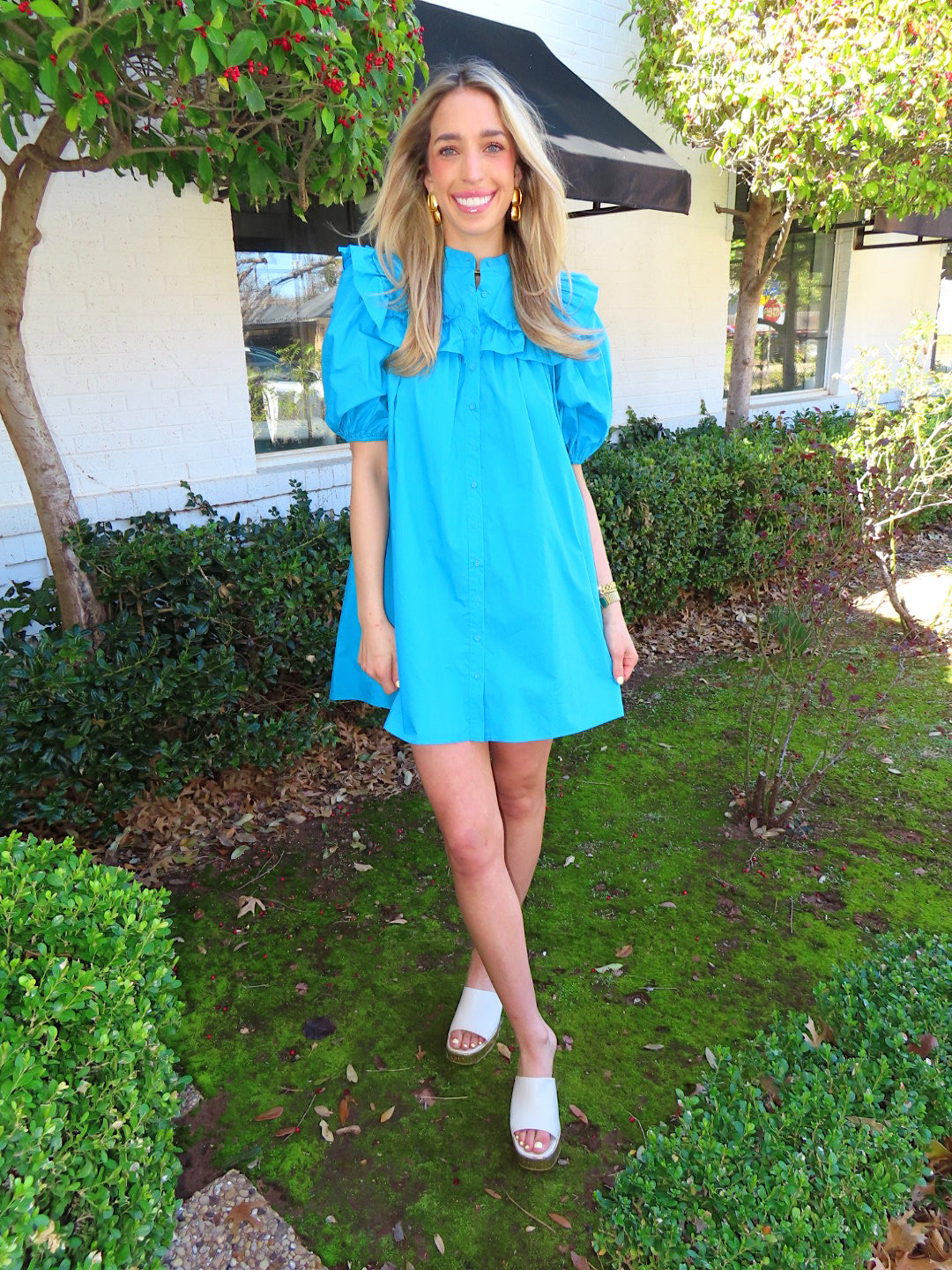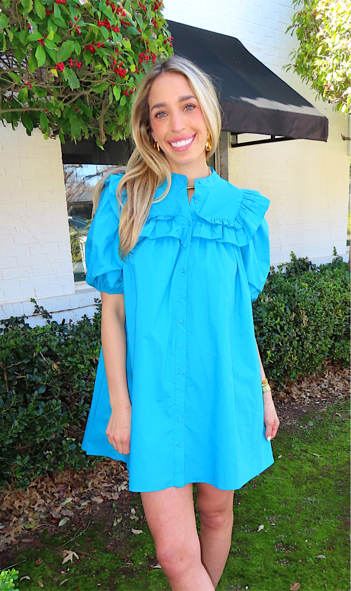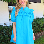 TURQUOISE PUFF SLEEVE RUFFLE DRESS (size large left)