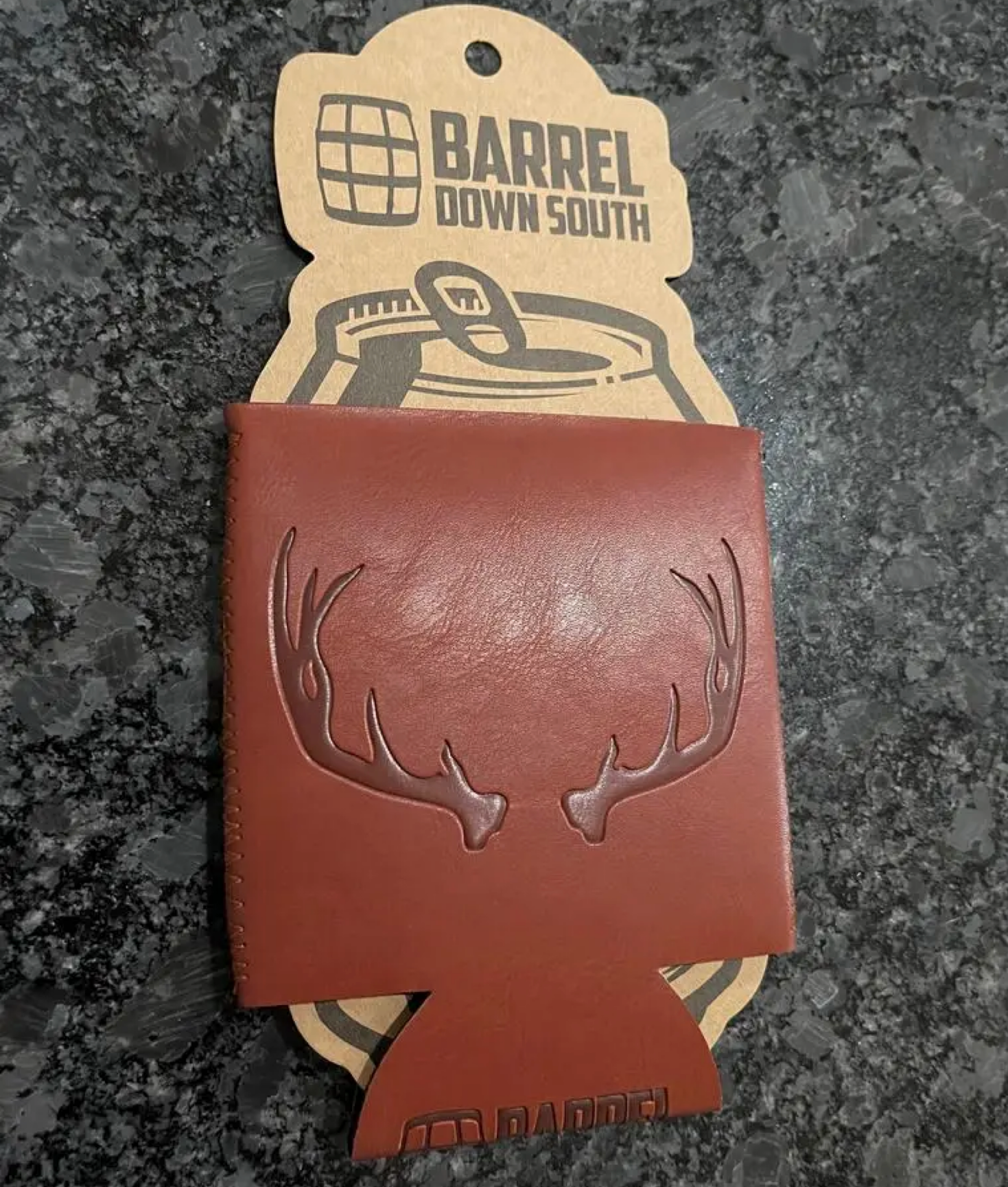 Our Deer Antler Hunting Can Cooler is made of faux leather and lined with neoprene to keep your favorite beverage ice cold.