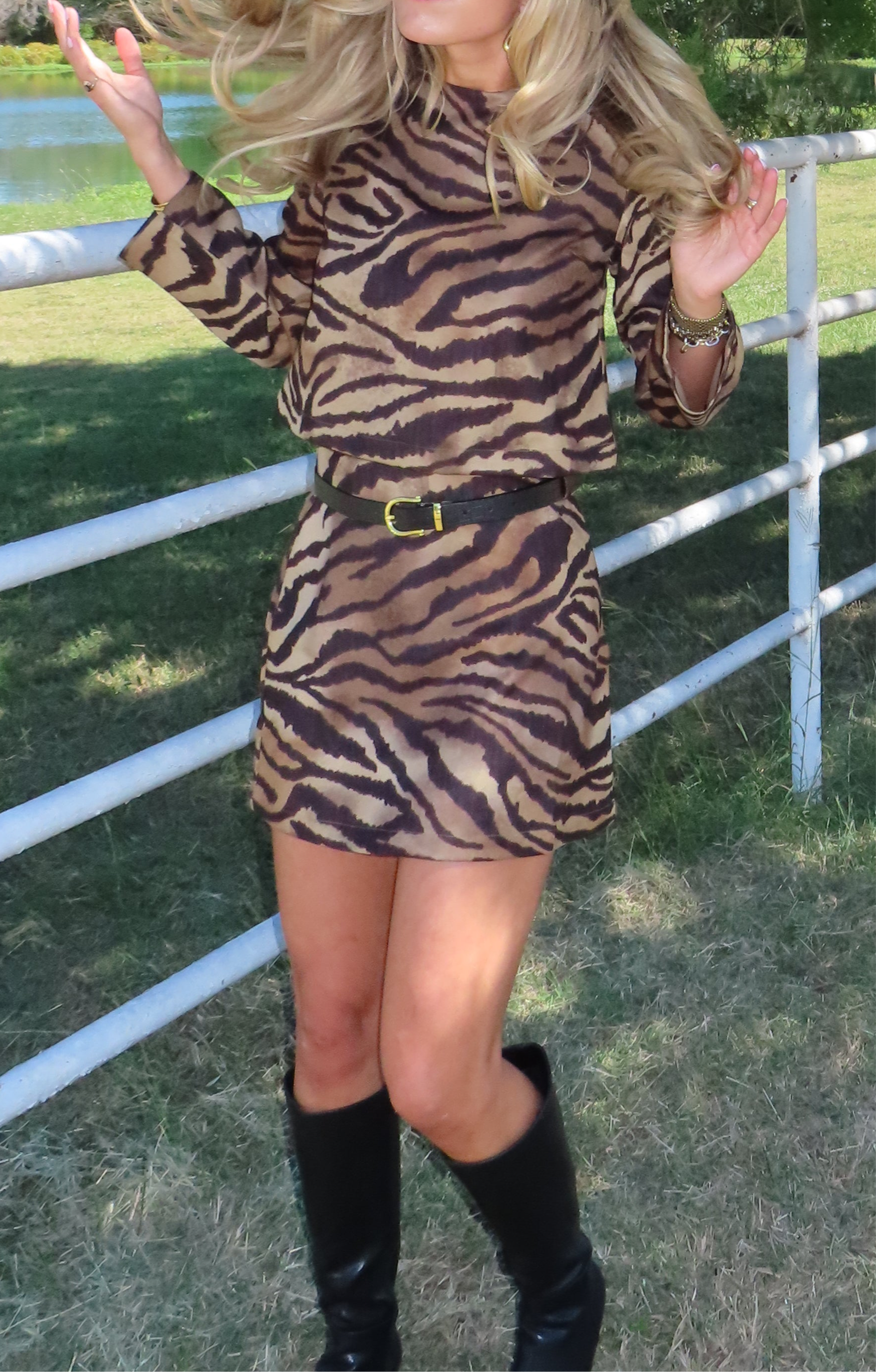 -The skirt zips up the left side, runs a tag big but I added a belt for the look!