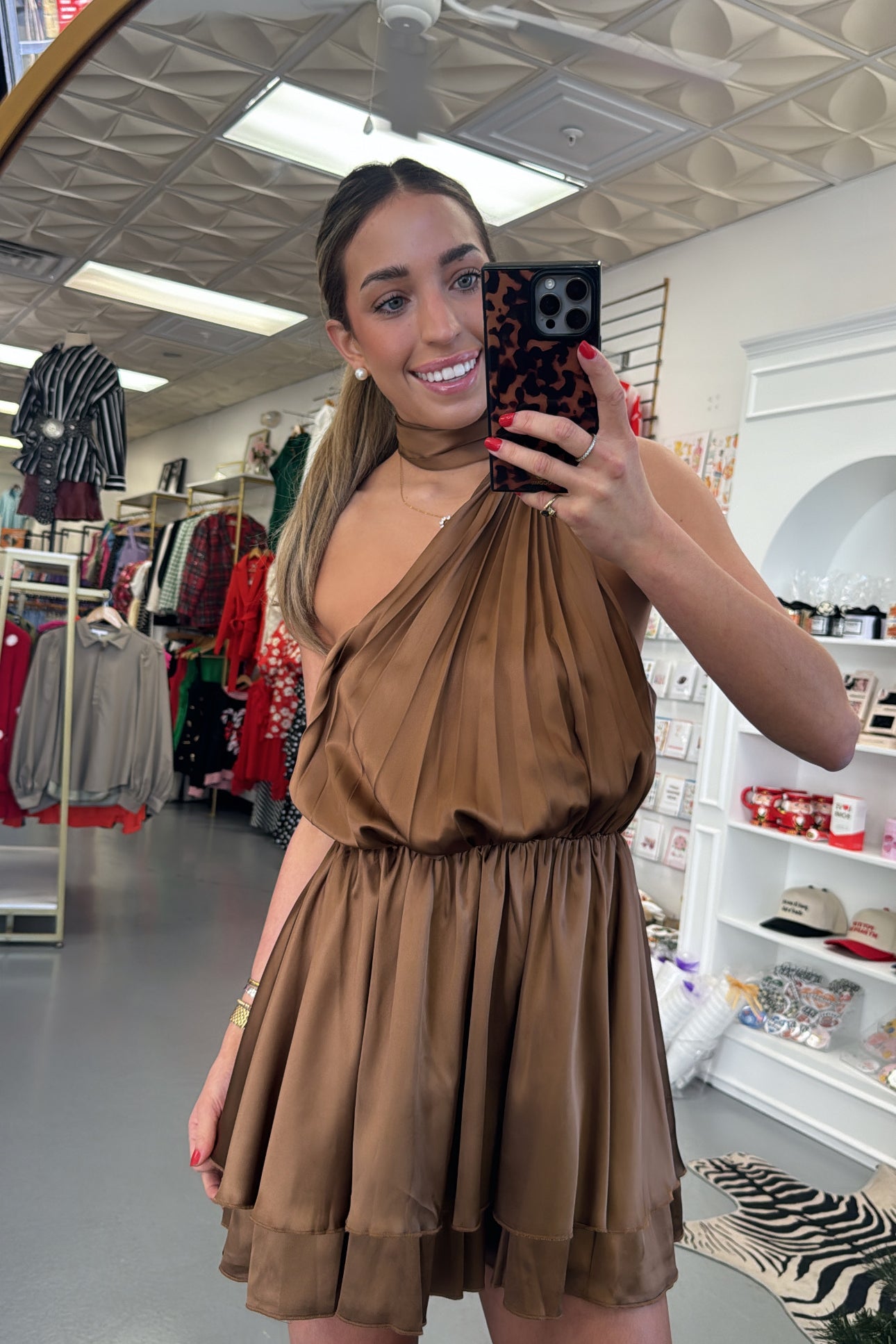 Champagne Brown Ruffle Halter Neck Mini Dress