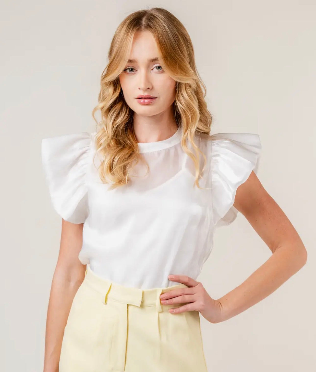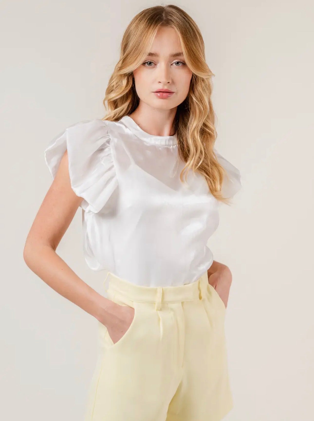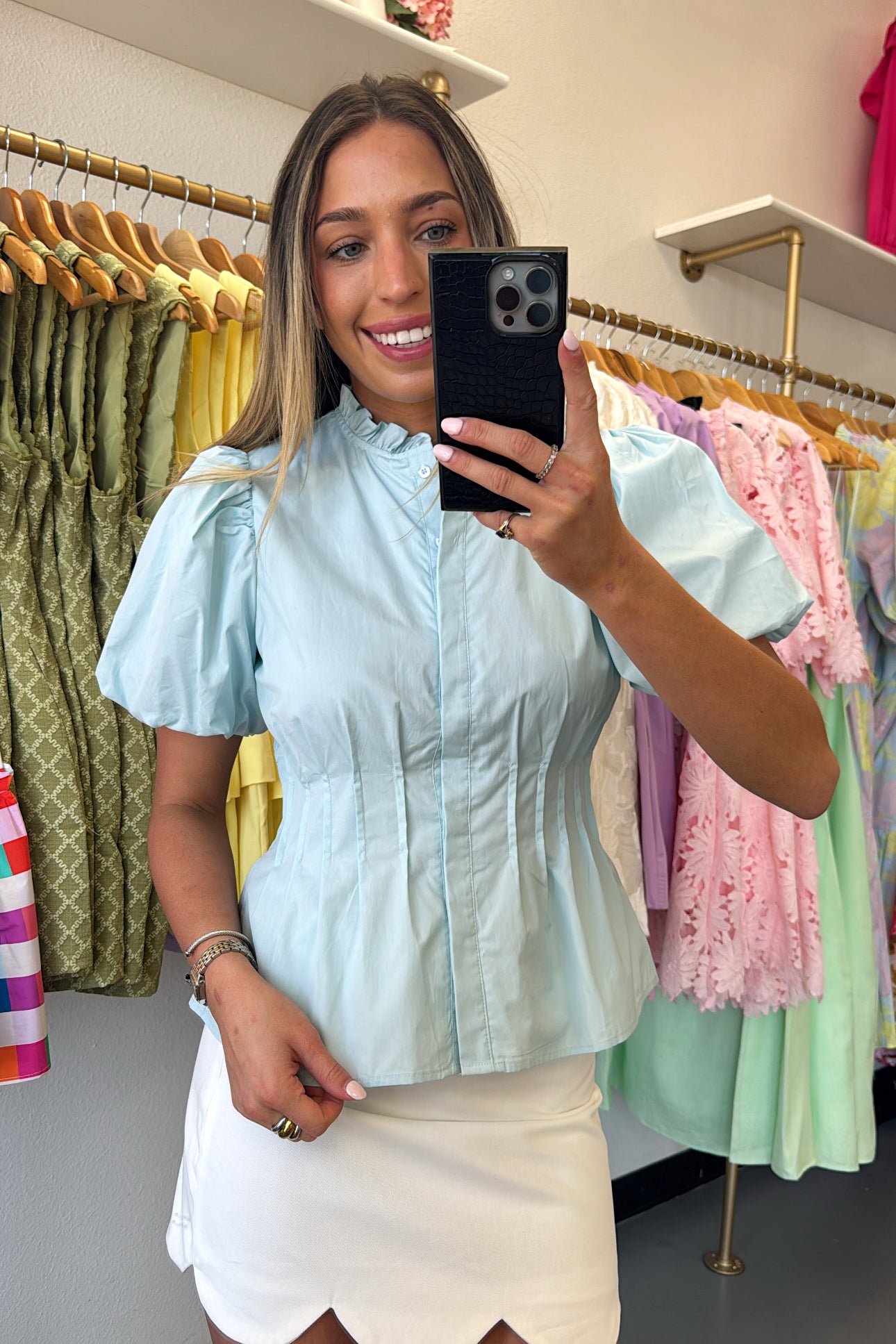 BLUE RUFFLE MOCK NECK BUTTON TOP