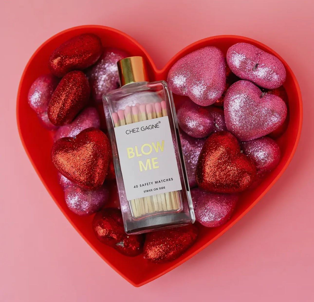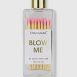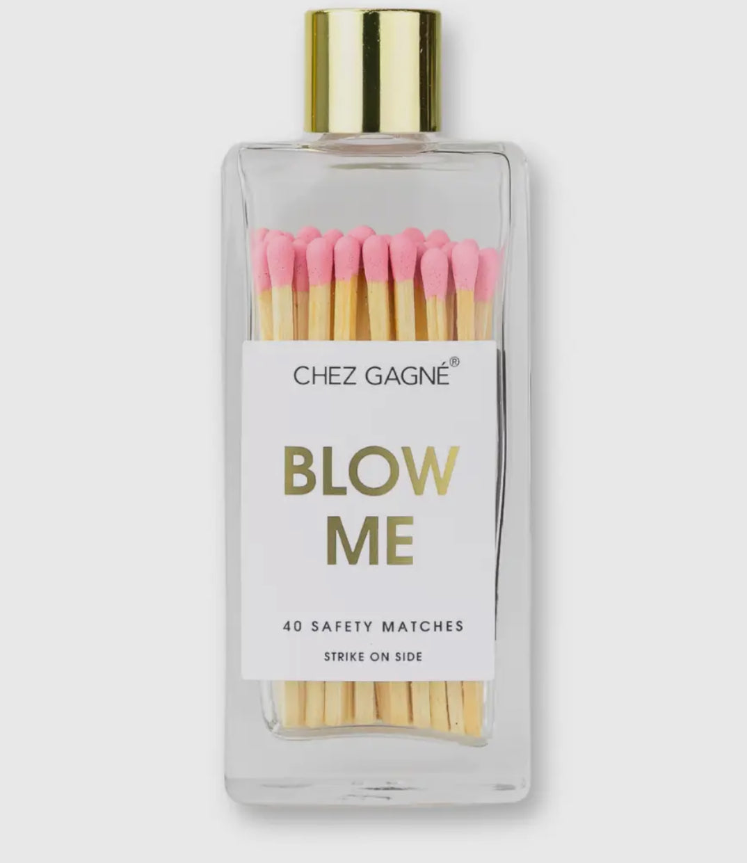 For those playful, not-so-innocent evenings .These matches are for those who appreciate a good flame and an even better finish. Phrase: Blow Me Glass Bottle with gold lid 40qty Safety Matches Pink Tipped Striker on Side of Bottle for easy strike and light 1.84 x 4.75, 1.8oz Glass Bottle **Matches are available only to United States Retailers at this time due to international shipping constraints. note: tip color may vary slightly from picture due to the nature of production