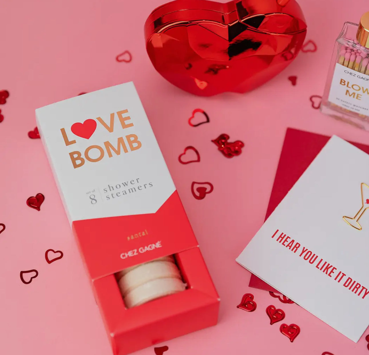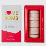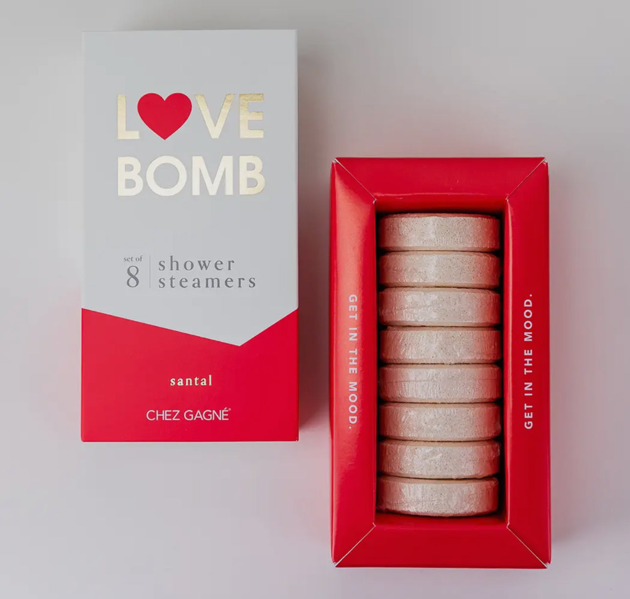Feelin' the love? Let the sexy scent of santal sweep you off your feet (not literally) with our aromatherapy shower steamers. No commitment needed. Set of 8 Aromatherapy Shower Steamers Made with Essential Oils + Premium Parfum Scent: Santal Box Size: 6 x 3 x 2 Set of 8: .8 oz Tablets / Tablets Measure 1.75 x.5 Made in California No Phthalates, No Parabens, No Sulfates