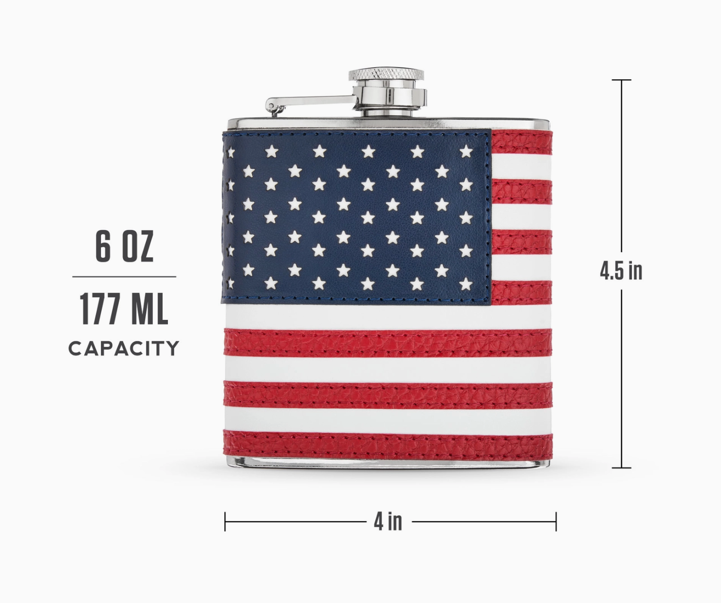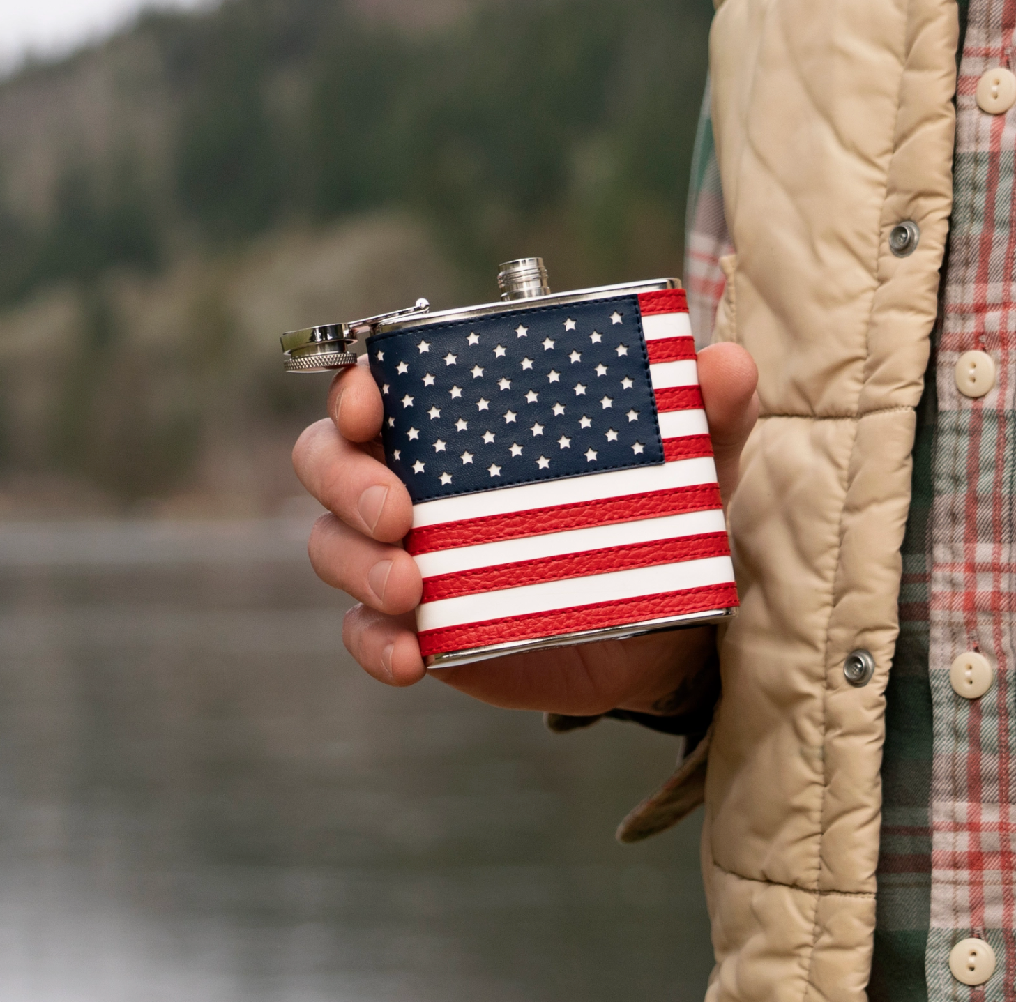 This is America, and we drink American - so fill the American Flag Flask up with some down-home distillate and show your true colors. With Old Glory in your pocket, every day is Independence Day. Accommodates 6 oz comfortably Stainless steel construction Includes funnel Makes a great gift Foster & Rye combines rugged utility with quality materials and classic vintage stylings for barware accessories that stand the test of time. Discover metal camping mugs, novelty bottle openers, and leather flasks that are perfectly at home on your bar cart or in the great outdoors. Disclaimer : Flasks aren't meant for storing alcohol long-term. Leaving liquor in a flask for too long might lead to undesirable flavors. To keep things fresh, finish or replace the contents within a few days. Cheers and happy sipping!