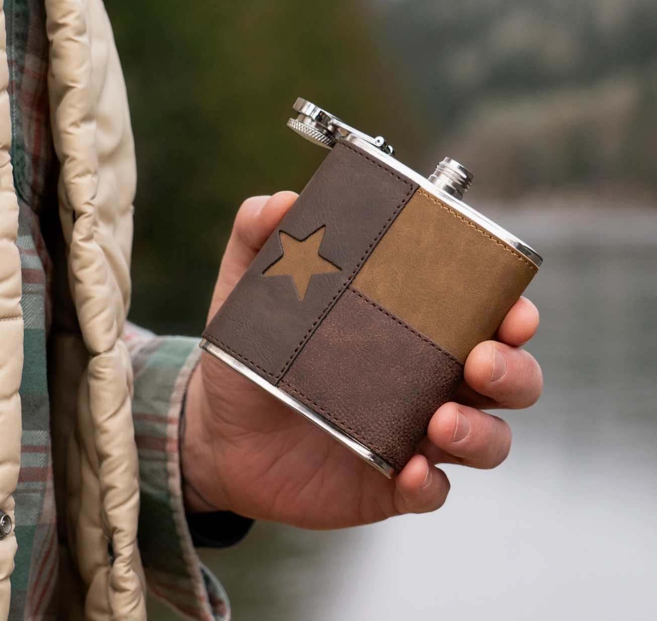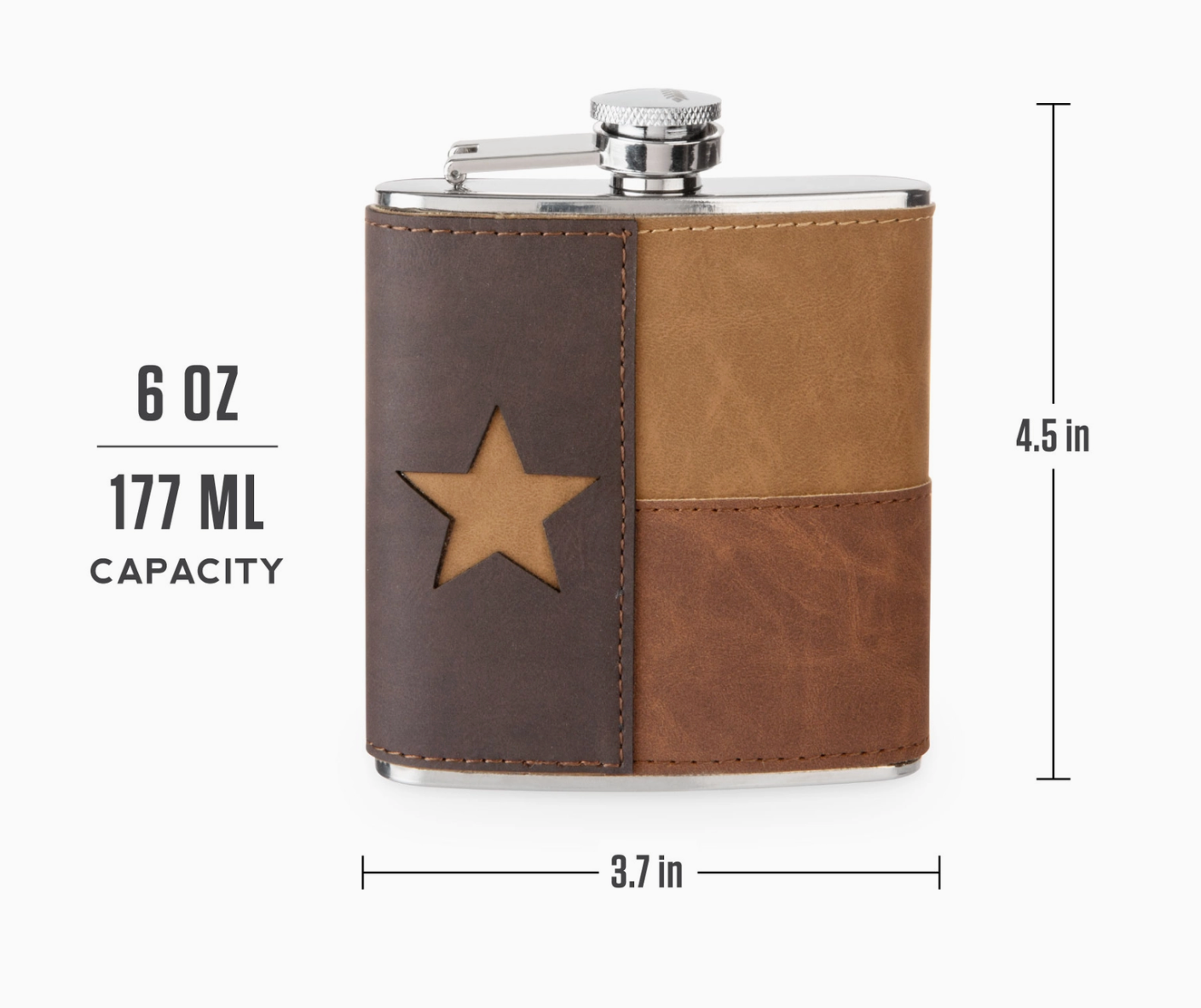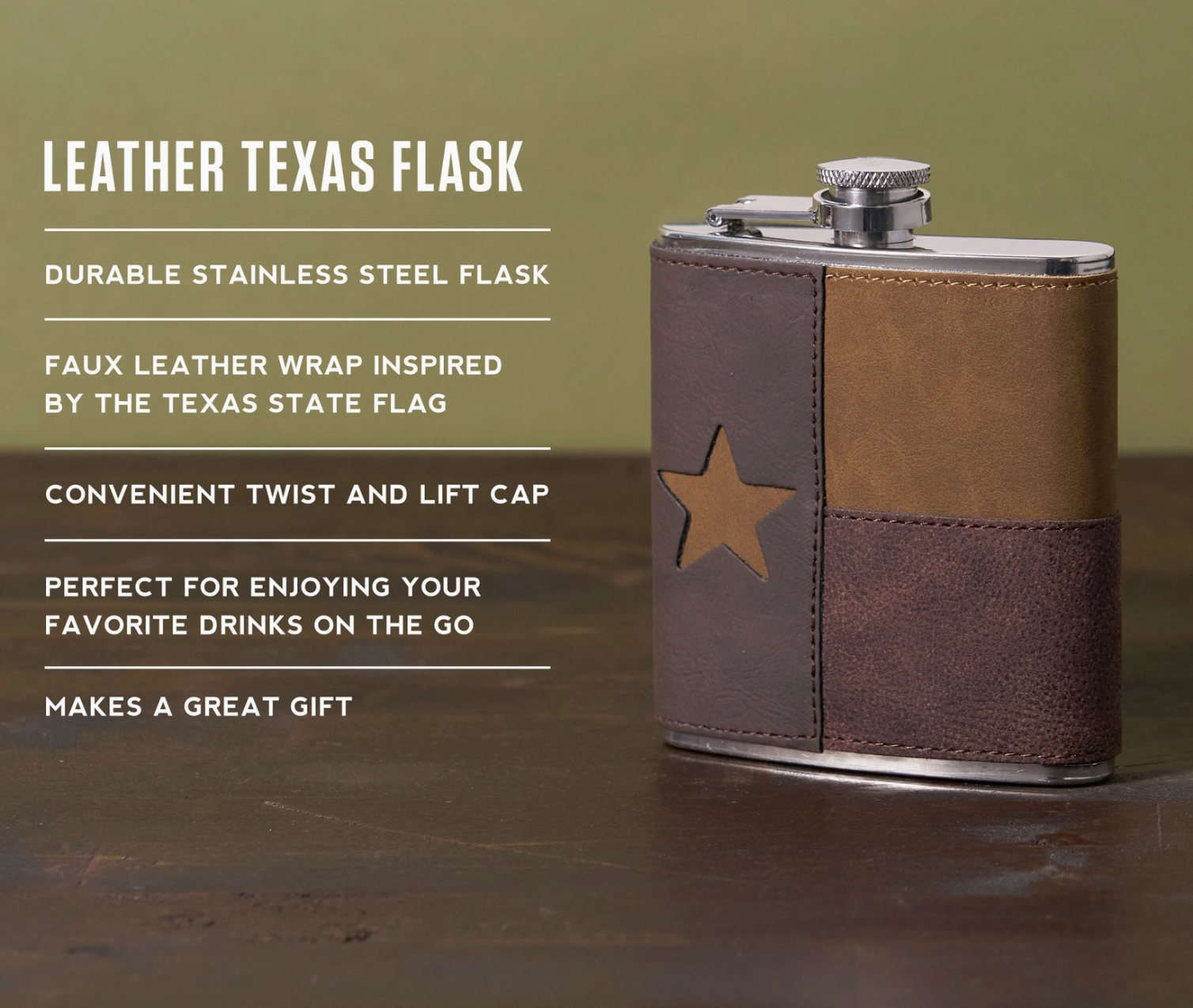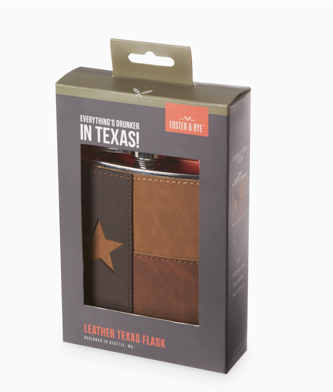 Everything's drunker in Texas. Keep spirits high with this 6 ounce stainless steal flask, outfitted with faux leather and country pride. Holds 6 oz Stainlesss steel and faux leather wrap Twist and lift lid Foster & Rye combines rugged utility with quality materials and classic vintage stylings for barware accessories that stand the test of time. Discover metal camping mugs, novelty bottle openers, and leather flasks that are perfectly at home on your bar cart or in the great outdoors. Disclaimer : Flasks aren't meant for storing alcohol long-term. Leaving liquor in a flask for too long might lead to undesirable flavors. To keep things fresh, finish or replace the contents within a few days. Cheers and happy sipping!