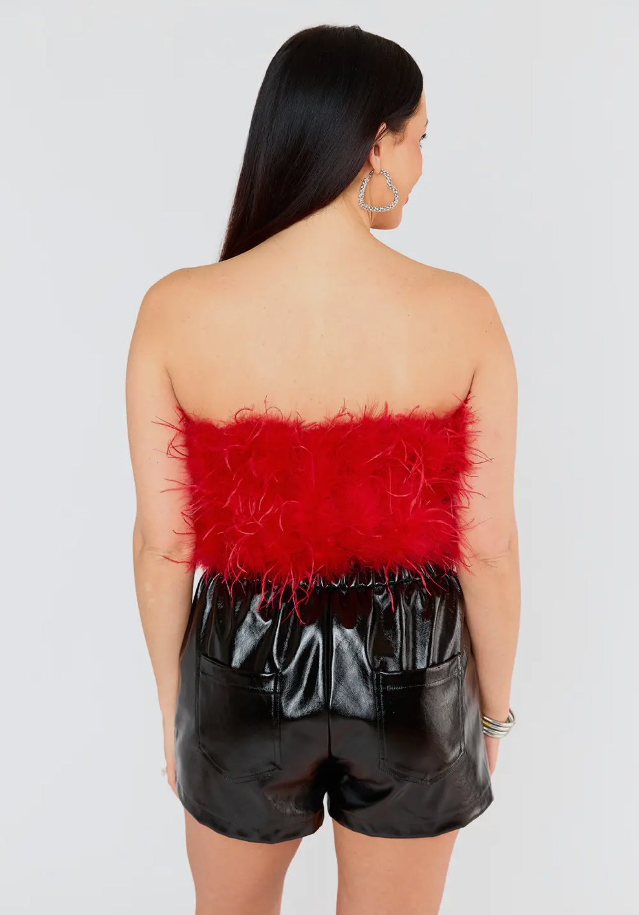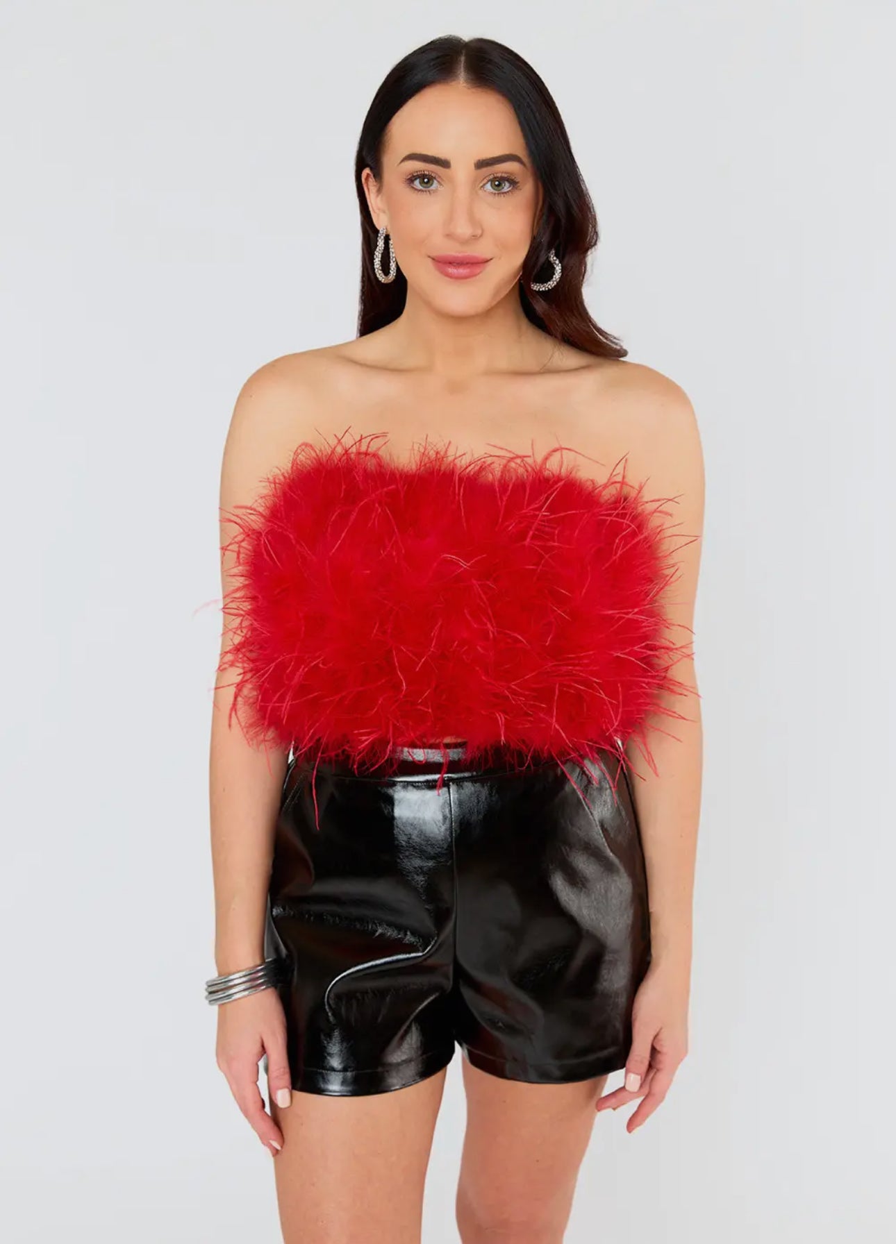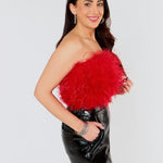 Now this is a statement top! Fancy features feather detailing and an elastic band with good stretch. She looks amazing on so many different body types, and the styling options are endless. She comes in many different colors, so add the Fancy Feather top to your cart now! Product Description: Fit: The Fancy Top runs true to size. Length: Cropped fit falls at natural waist. Bust: Relaxed fit accommodates all bust sizes. Waist: Cinched waist. Fabric: Fabric contains minimal stretch. Material: 55% Polyester, 45% PU, Lining-100% Polyester
