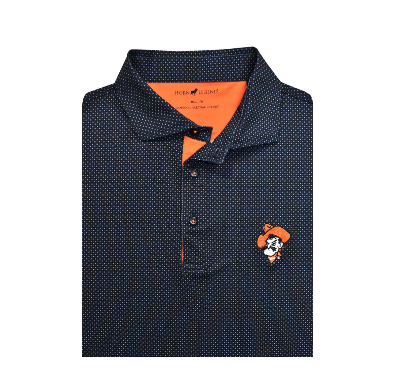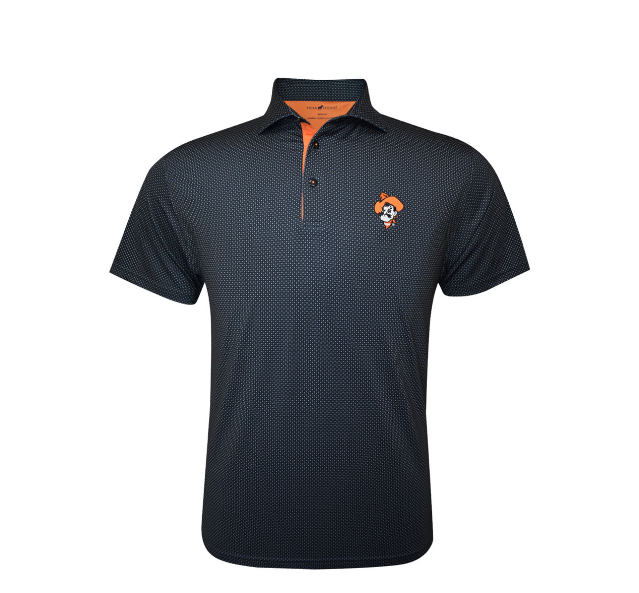 Show off your Oklahoma State pride with the Oklahoma State Pistol Pete Black Checkers Polo. This sleek black performance polo features a subtle micro-check pattern and the iconic Pistol Pete logo embroidered on the chest, celebrating OSU’s rich tradition. The contrasting orange interior collar and placket add a bold pop of Cowboys spirit. Designed with moisture-wicking and breathable fabric, this polo ensures all-day comfort whether you're at the office, on the golf course, or cheering on OSU. A must-have for any true Cowboys fan looking for style and performance!